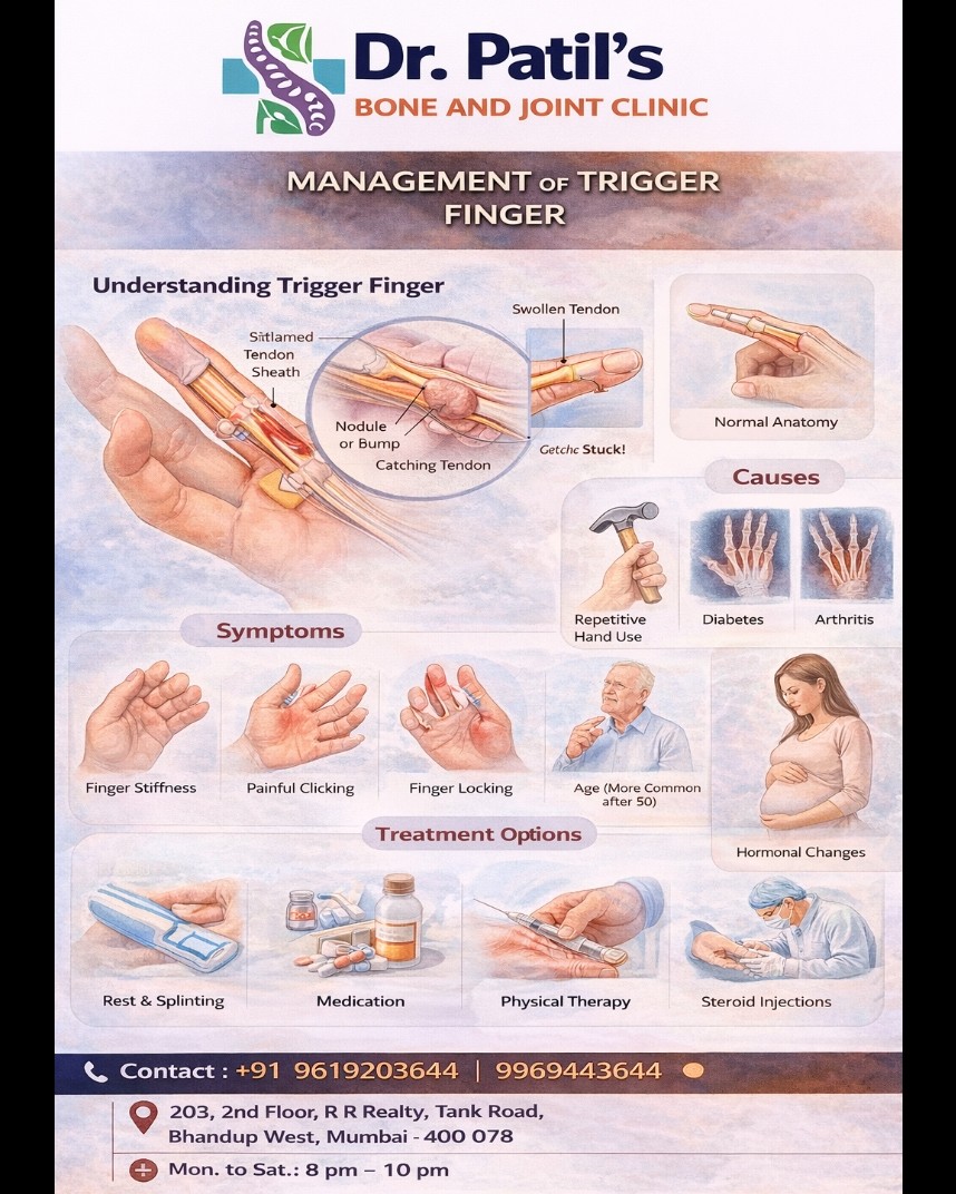 Management of trigger finger involves physiotherapy, splinting and medications. In severe cases steroid injection or trigger finger release is required.